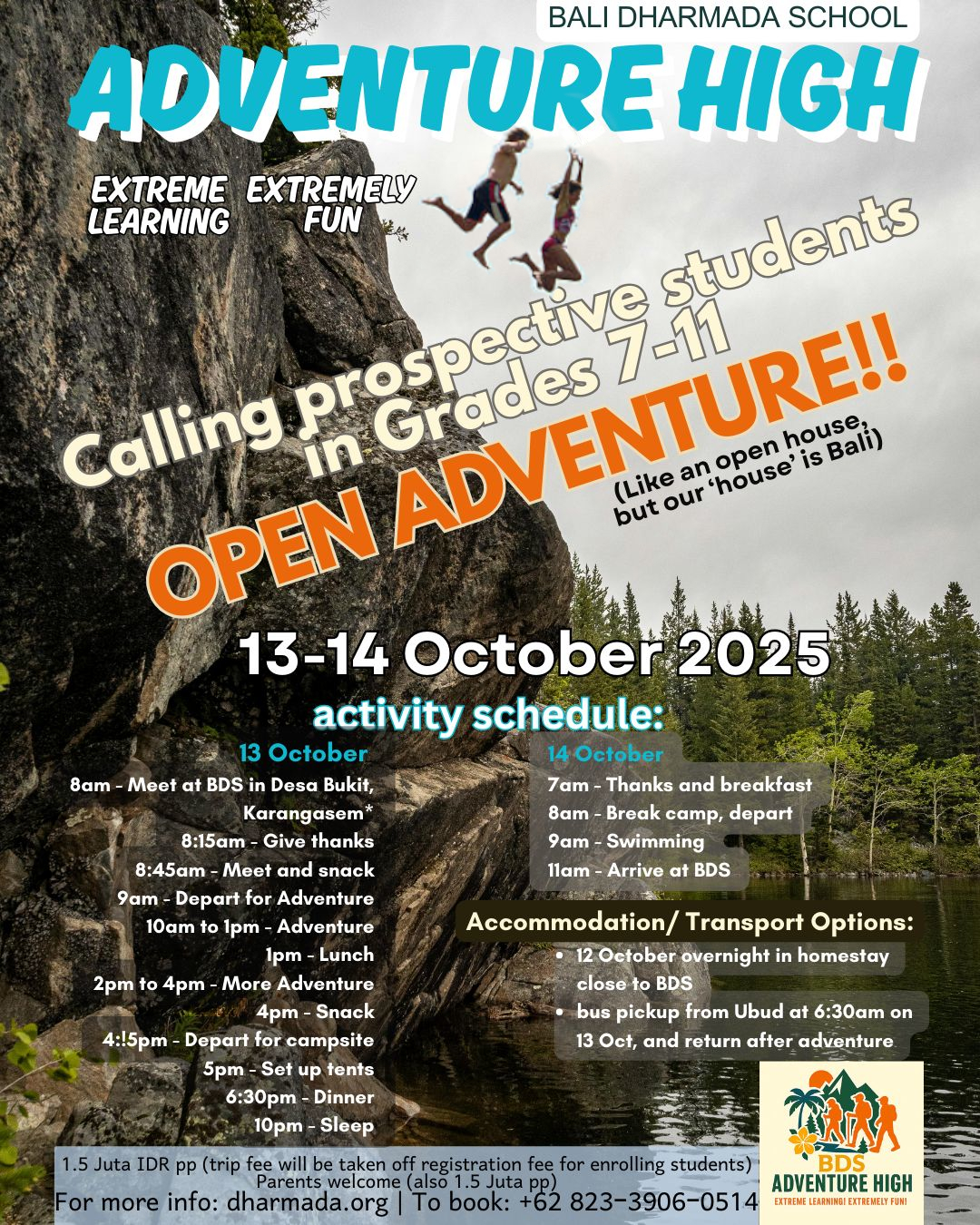 Adventure High is a fully experiential outdoor adventure-based junior and senior high school program at Bali Dharmada School (BDS) in the sacred tropical forests of Bukit Village, Bali.